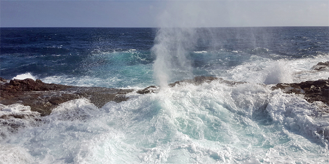 Between the bigger basin and the Atlantic Ocean there is a small hole in the rocky ground, through which at high tide the foam shoots up into the air for several metres, like a steam engine, with snorting sounds like a waterspout fountain. This spectacle reminds of a geysir, but appearances are deceitful. While a geysir has volcanic causes, the origin of the Bufadero del la Garita is maritime.