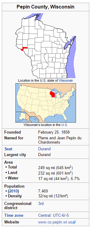 Wisconsin is made up of 72 counties, this cache is focused on Pepin county. Pepin County is a county in the U.S. state of Wisconsin. As of the 2010 census, the population was 7,469, making it the fourth-least populous county in Wisconsin. Its county seat is Durand. Pepin County was the birthplace of Laura Ingalls Wilder. Here are a few stats about Pepin County, courtesy of Wikipedia. You can learn more about Pepin county at: https://en.wikipedia.org/wiki/Pepin_County,_Wisconsin