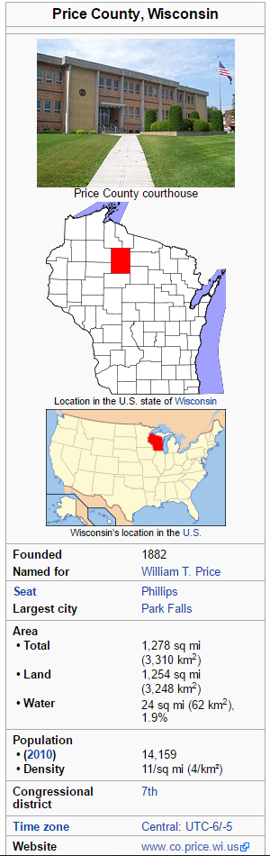 Wisconsin is made up of 72 counties, this cache is focused on Price county. Price County is a county in the U.S. state of Wisconsin. As of the 2010 census, the population was 14,159. Its county seat is Phillips. Here are a few stats about Price County, courtesy of Wikipedia. You can learn more about Price county at: https://en.wikipedia.org/wiki/Price_County,_Wisconsin