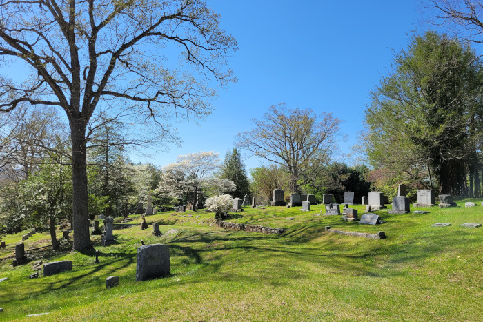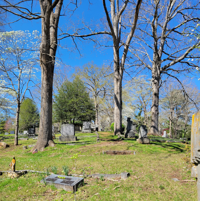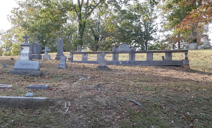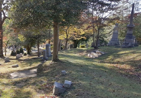 Off in the distance seen in this photo, is an unusual gravestone with a gabled roof and four columns.