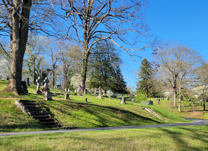 Locate the next area and near a rounded stone border is a lovely floral monument that came from the gravestone shop of Thomas Wolfe's father. Find the stone.