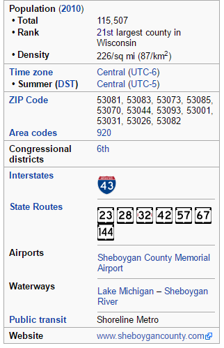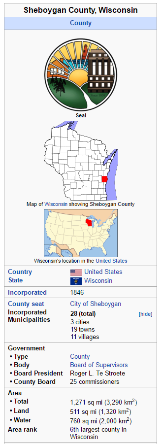 Wisconsin is made up of 72 counties, this cache is focused on Sheboygan county. Sheboygan County is a county in the U.S. state of Wisconsin. It is named after the Sheboygan River. As of the 2010 census, the population was 115,507. Its county seat is Sheboygan. The county was created in 1836 and organized in 1846. At the time, it was located in the Wisconsin Territory. Sheboygan County comprises the Sheboygan, WI Metropolitan Statistical Area. Part of the Holyland region is located in northwestern Sheboygan County. Here are a few stats about Sheboygan County, courtesy of Wikipedia. You can learn more about Sheboygan county at: https://en.wikipedia.org/wiki/Sheboygan_County,_Wisconsin