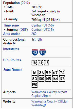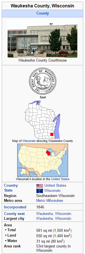 Wisconsin is made up of 72 counties, this cache is focused on Waukesha county. Waukesha County (pronounced WAW-ke-shaw) is a county in the U.S. state of Wisconsin. As of the 2010 census, the population was 389,891, making it the third-most populous county in Wisconsin. Its county seat is Waukesha. Waukesha County is included in the Milwaukee–Waukesha–West Allis, WI Metropolitan Statistical Area. Here are a few stats about Waukesha County, courtesy of Wikipedia. You can learn more about Waukesha county at: https://en.wikipedia.org/wiki/Waukesha_County,_Wisconsin