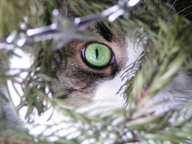 Die Katze hängt am Baum, nein, nicht am Katzenbaum, am Weihnachtsbaum. Sie hat die Kugeln baumeln sehen, das hat sie angemacht, diese vom Baum zu nehmen. Ein Sprung, ein Satz und schon hing sie am Ast. Dabei hat sie der Kugel einen Schlag verpasst, diese flog direkt auf Opa's Glatz, Opa hat sich taumelnd hingesetzt, derweil fiel die Kugel vom Kopf ins Netz. Angler Opa hats geschenkt gekriegt, den ganzen Abend fischte er nach einem Kasten Bier. Er staunte nicht schlecht als die Kugel wippte, hin und her in seinem Netz und plötzlich kippte. Das war des Katzis Zeichen, sie springt und kriegt die Kugel zwischen ihre Pfotenreiche. Was jetzt passierte, kann man sich schenken, sie rannte mit der Kugel durch Türen, spielte auf Tischen und Bänken, sie wirbelte herum und jonglierte, tanzte dabei Beethovens vierte... Die Kugel war alsbald dahin, die Gäste gingen nach Hause, das war dann doch ein bisschen viel.