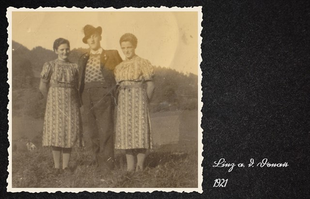 Und auf dem Foto siagst mein Vota mit da Muatta und da Nochbarin. De hot domois auf 13 gwohnt. Glaubst mir follad nu ei, wia de ghoassn hot. Woasd wos: i schreib jetzt do amoi A hin. Du findst sicha ian Vornaum aussa und dann sitz ma uns nu amoi zamm und schreibn des ins Album eini.