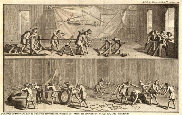 La production de cordages, comme la création de forêts de chênes, pour produire les mats et les vergues, fut initiée par Colbert, dès les années 1660. Son objectif était de faire de la marine française une rivale sérieuse de la marine britannique.