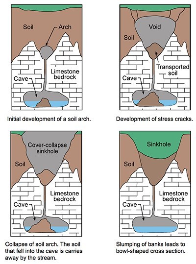 Upper left, the soil arch develops; upper right, the arch begins to fail; lower left, the arch has collapsed and soil has been transported underground; lower right, the walls of the collapse slump and the depression takes on the classical bowl shape of the sinkhole until the next collapse. Source: Kentucky Geological Survey, University of Kentucky