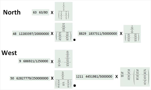 Dust off those high school math books and get yourself a calculator that can handle a lot of digits. This cache is an equal opportunity for all denominators (and numerators). In the fractions presented there are NO addition or subtraction operations. Everything is either a division or multiplication. A 'dot' between two fractions means multiply.