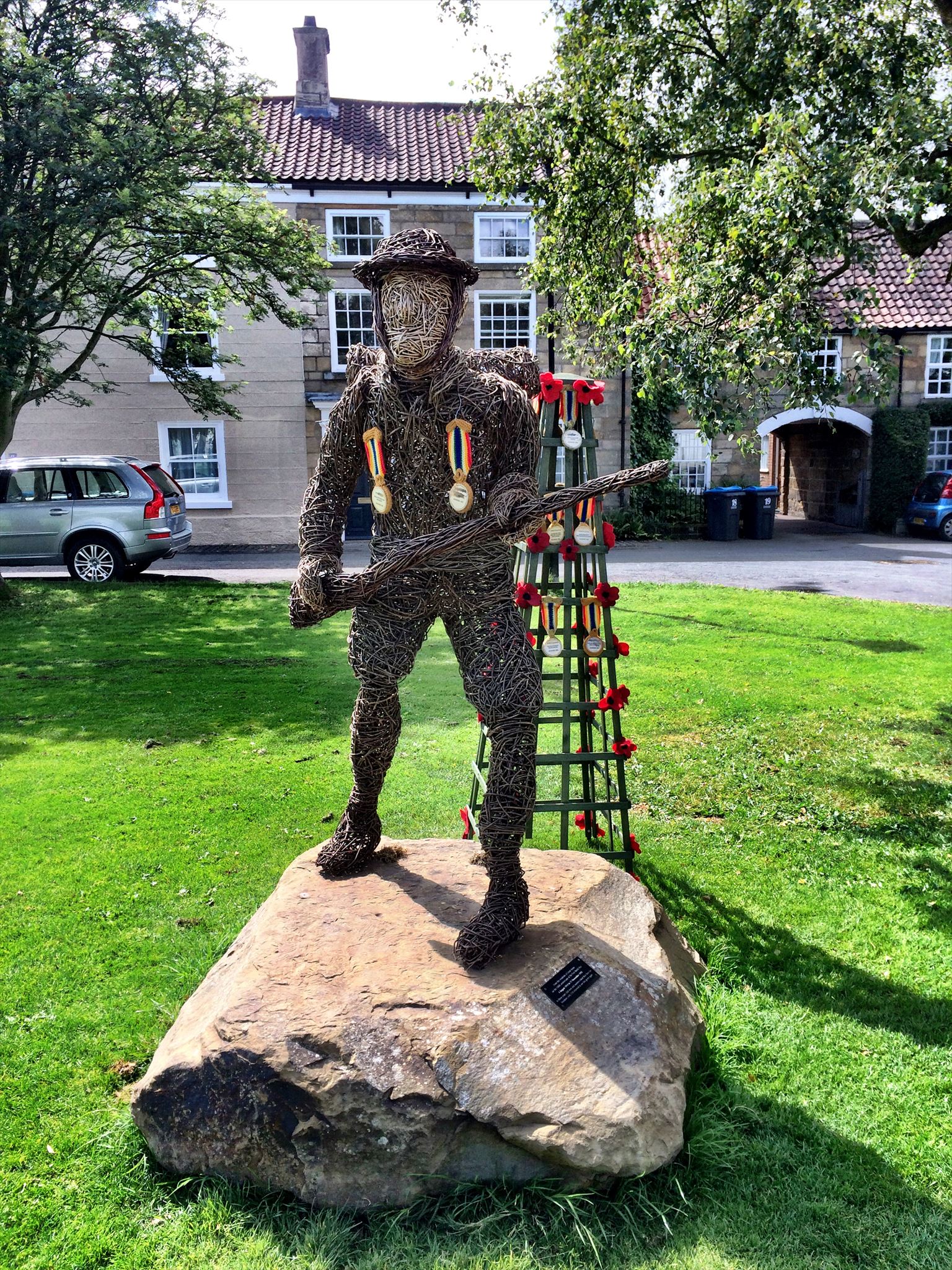 A willow sculpture of a soldier on the village green will also be awarded a posthumous, knitted medal for each soldier, created by the Great Ayton Knit and Knatter group.