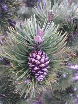 La tija és llenyosa. Pel que fa a les flors el mateix pi en presenta de masculines i de femenines, les masculines són rosades o grogues i les femenines vermelles. Els fruits són pinyes petites (de 5 a 7 cm de llarg). Les esquames acaben en una punxa triangular en forma de ganxo.
