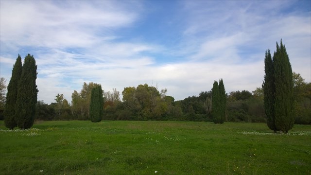 Sur cette aire ont été plantés de nombreux cyprès par groupes de trois.