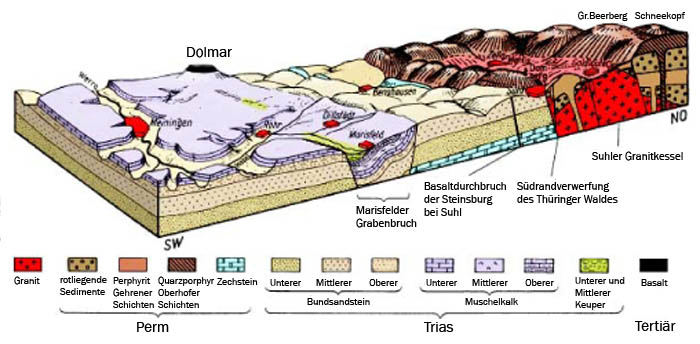 Unter dem Marktplatz von Suhl verläuft die geologische Grenze zwischen dem Thüringer Wald und seinem süwestlichen Vorland. Hier wird der dominierende Buntsandstein des Haseltales und seiner sanfthügeligen Berge von den schrofferen, aus widerstandsfähigen Porphyren und Porphyriten bestehenden Gip- feln des Gebirges getrennt. Die für das Erscheinungsbild der Stadt so charakteristischen Massive des Domberges, Döllberges, Ringberges, Eisenberges und Beerberges überragen den durch tiefgründige Verwitterung großflachig ausgeräumten Suhl-Zella-Mehliser Granitkessel um mehrere hundert Meter.