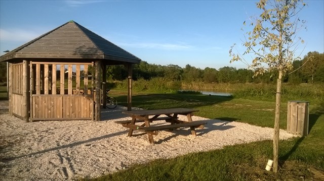 Une table et des bancs permettent de s’asseoir pour une pause gourmande et l'abri en bois est très apprécié lors de fortes chaleurs ou lorsqu’on se fait surprendre par la pluie !