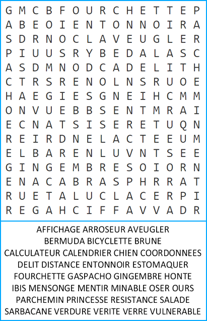 Il faut retrouver tous les mots de la liste dans la grille de lettres.
