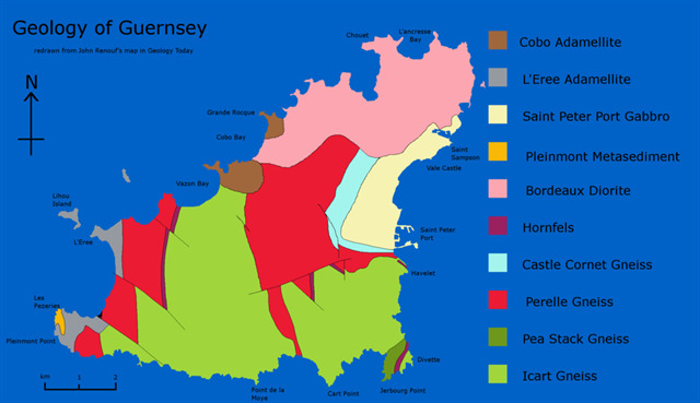 Some of the rocks on Guernsey are very ancient. The southern part of the island is largely composed of Precambrian gneiss. This has a composition similar to granite and appears to have been metamorphosed from this rock around 2,061 million years ago according to U-Pb dating on zircon grains.