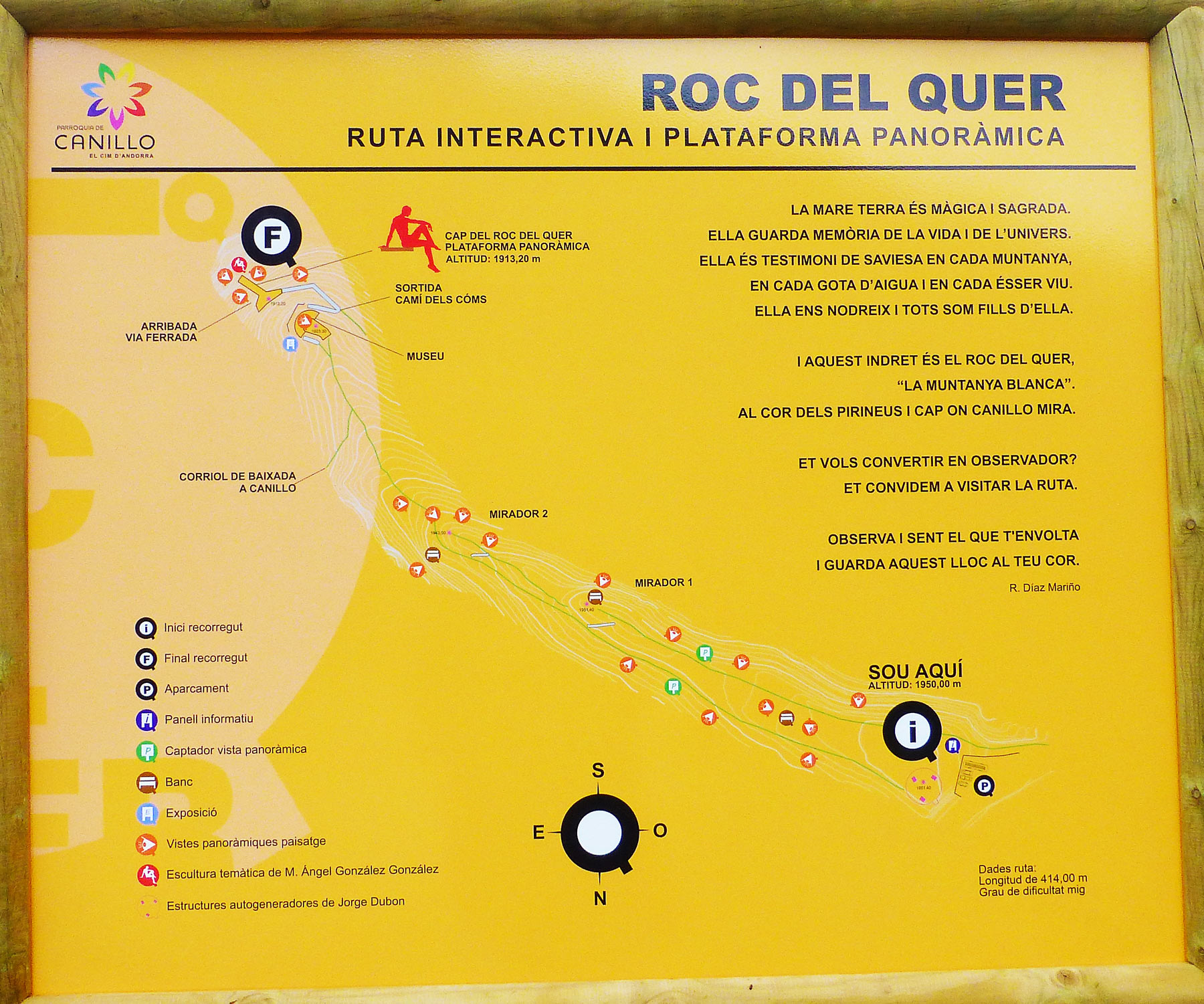 The access from Canillo is easy to locate. At the viewpoint of the Roc del Quer you arrive from the kilometer point 6.5 of the road of Coll de Ordino (CS340). Here are the "Self-Generating Structures", a set of 3 wooden totems of the Mexican artist Jorge Dubón, installed in 1991. In 5 minutes you walk from the two parking areas without difficulty to the Mirador. (Text: from internet)