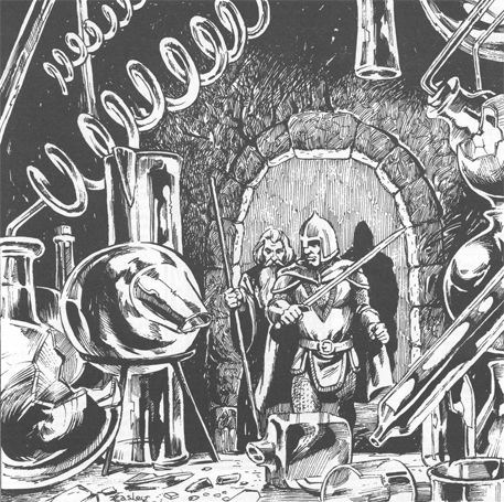 Carefully does it in this room, it is coated in razor sharp broken glass from all manner of long shattered experimental chemistry equipment. Who knows what diabolical potions were concocted here. A few pieces of glassware from past efforts are still stacked about. Leif carelessly picks up a flask and cuts himself deeply on a glass shard (-2 hit points). Hilgaarde quickly reminds everyone to leave everything to her and discovers a potion of energy. You can use this to restore some vigour to your spellcasting efforts (+2 spell points).