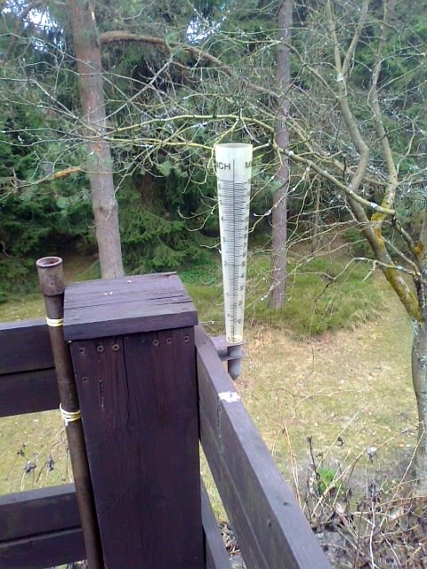 Na obrázku je jednoduchý srážkoměr pro amatérské měření. Je z průhledného plastu a má tvar nahoře otevřeného komolého kužele. Jeho dno (a) má průměr 18 mm, otvor nahoře (b) 40 mm a výška srážkoměru (c) je 220 mm. Stupnice udává množství srážek h v milimetrech (čili v litrech na každý čtvereční metr vodorovné plochy). Srážkoměr se umisťuje na volné prostranství a upevní vhodnou objímkou, ze které ho lze snadno vyjmout a každé ráno vodu vylít (fotka jeho instalace na verandě naší chaty je zde).