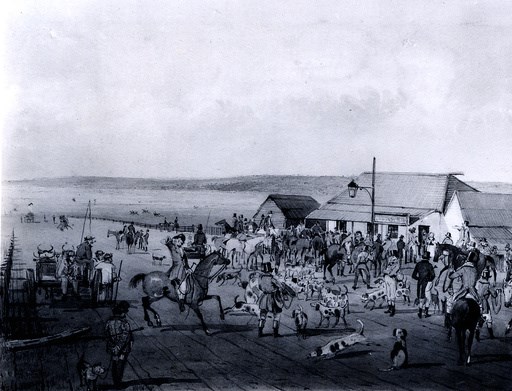 Photo: State Library of South Australia [B 6413]. A Hunt meet at Dry Creek, near Adelaide, 1845: reproduced from a watercolour by S. T. Gill. This illustration shows Hill's Dry Creek Inn.