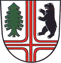 Abb. Das Wappen von Hermsdorf: In Silber ein silbernes, rot bordiertes Stützbogenkreuz, das mit einem roten Fadenkreuz belegt ist, dessen Schnittpunkt sich in Schildfußhöhe befindet; vorn ein grüner Nadelbaum, hinten ein schwarzer Bär.