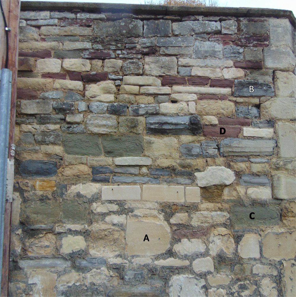 For the outer walls of the surrounding buildings the builders would use whatever stone came to hand as in the wall for the picture question. In its heyday before the Reformation (circa 1540) the cathedral was surrounded by satellite services - masonry, milling, stables etc all with workshops to support the Abbey. Millers Green and the buildings "round the back" are remnants of these.