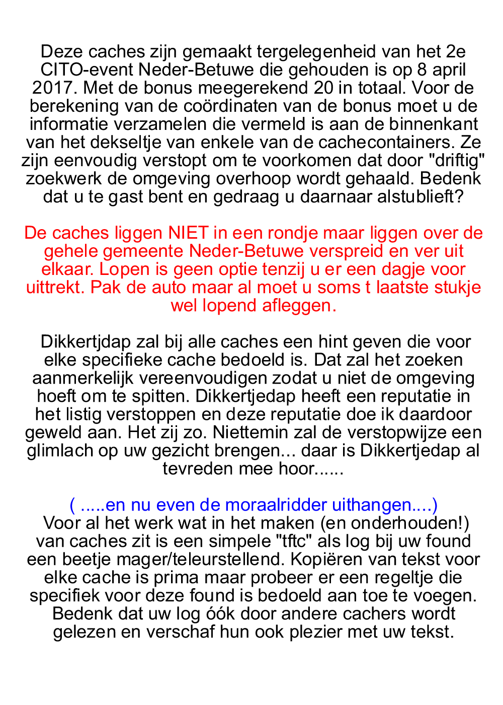 Wordt het boekje uitgedeeld met de speciaal voor dit event gelegde caches. Op dit moment zijn dat er 33. In tegenstelling tot vorig jaar liggen deze niet direct rond het eventterrein maar zijn ze over de gehele gemeente verspreid. Vervoer is dus wel nodig, auto of fiets. Zo lopen we elkaar niet in de weg en zijn de kansen voor podiumplaatsen voor iedereen kansrijk.