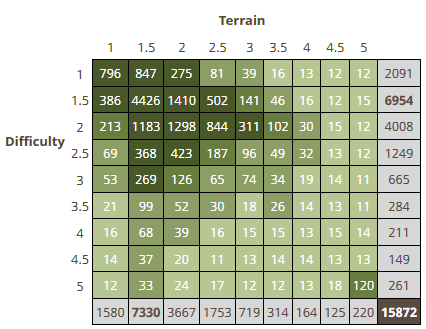 Find at least five caches of every difficulty/terrain combination (5 x 81 unique combinations).