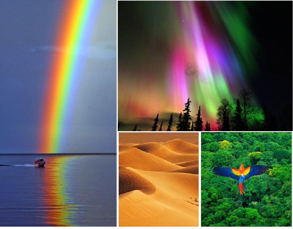 En los cambios de estación, desde la gama de ocres del desierto, los tonos azulados de los mares, pasando por los verdes de las selvas y los blancos de las regiones polares podemos disfrutar de todo el abanico de colores que nuestros órganos de visión son capaces de captar.