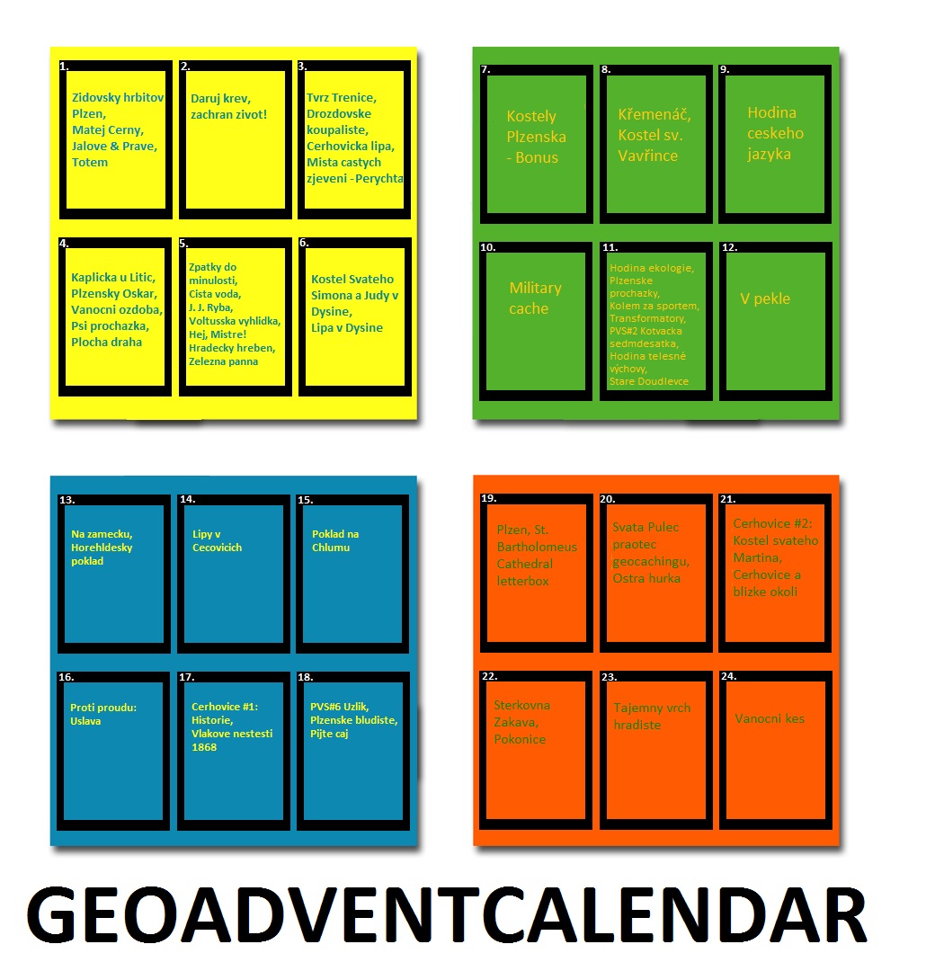 - Odlovit za sebou vždy minimálně jednu keš od 1. do 24. dne libovolného měsíce. Není třeba plnit výzvu zrovna v prosinci, nicméně pokud to tak uděláte, budete to mít tématičtější a potěšíte autora