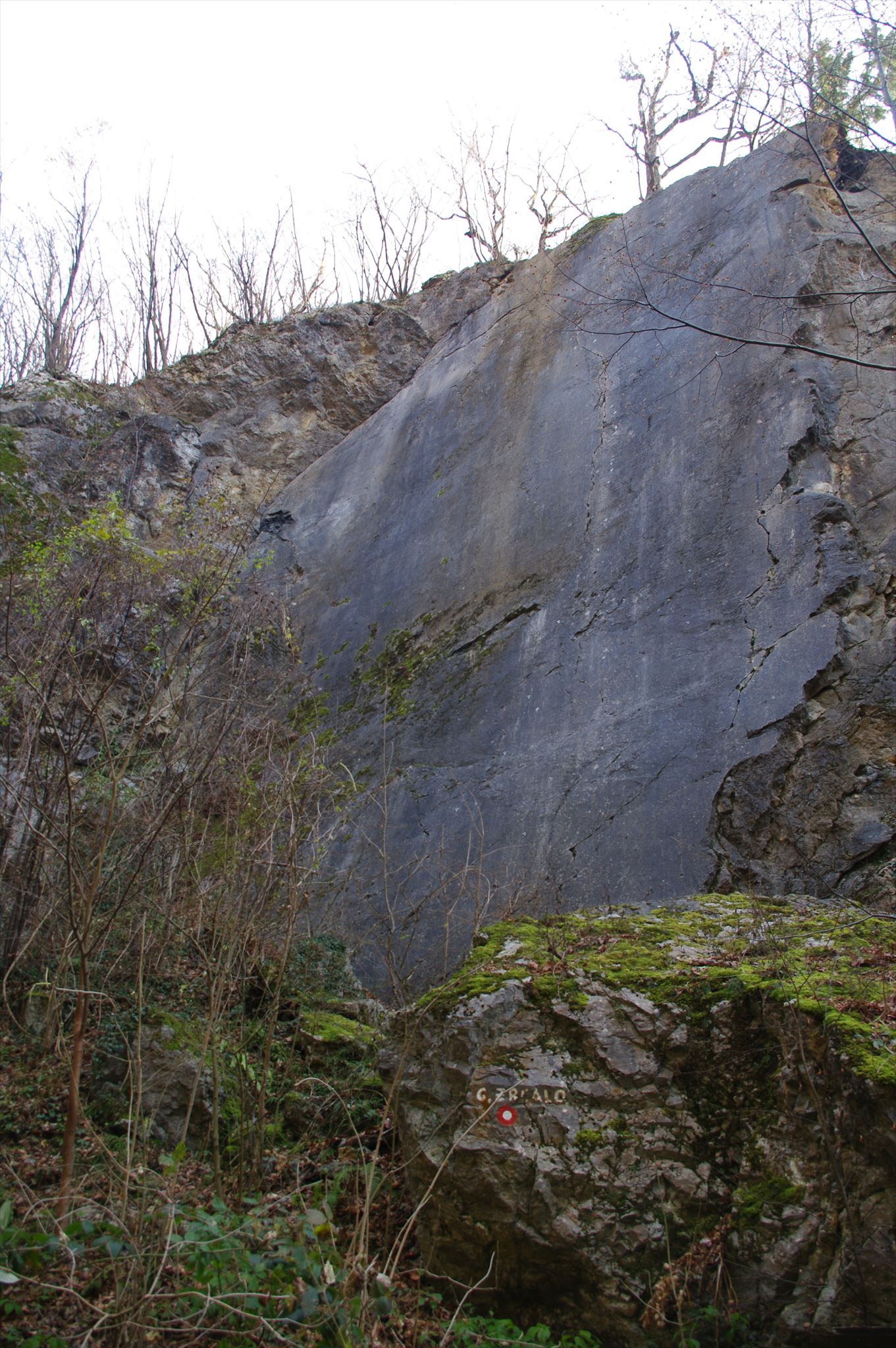 Now that we know the theory, we shall take a look at the locality. The mountain mirror is one of the most attractive natural sights in the Medvednica park. It is smooth, open, vertical cliff twenty meters high and as many wide, created as a fault plane along a tectonic crack. Notches on the rock indicate that in its geological past, the rock moved to the right. The rock is limestone, and looks like a granite. The site is today used for excursions and climbing.