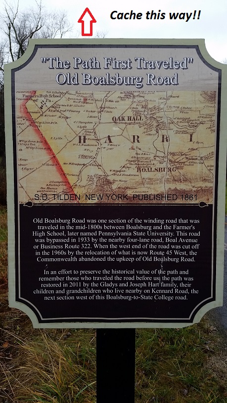 The entrance to the cemetery lies along Old Boalsburg Road, which was once a main artery between Boalsburg and the 'Farmer's High School', or as we know it today, Penn State. Accessing the cache is easiest by walking on the abandoned road next to the sign shown below, but closer parking is available by the Boal Barn or the museum proper.