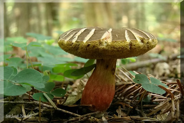 Kapelusz o średnicy 3-12 cm, początkowo bardzo poduchowato wypukły lub prawie półkulisty, później powoli się rozpłaszcza i niekiedy w środku zapada. Jest mniej lub bardziej brązowy, żółtobrązowy, często z oliwkowym odcieniem, ochrowo szary i niekiedy lekko czerwonawy. Skórka kapelusza sucha, matowa, delikatnie omszona lub zamszowo filcowata, podczas suszy pęka na drobne poletka i wtedy ukazuje się czerwonawa górna część miąższu, który czerwienieje również w miejscu żerowania robaków. Rurki początkowo bladożółtawe, wkróte stają się zielono żółtawe lub oliwkowo zielonkawe, niebieszczejące pod wpływem ucisku. Pory takiego samego koloru jak rurki lub bardziej brudnawe, szerokie i kanciaste; niekiedy lekko brunatno poplamione i pod wpływem nacisku mniej lub bardziej niebieszczejące. Trzon wysokości 3-10 cm, grubości 0.5-2 cm, przeważnie walcowaty, zwężający się ku postawie, często nieco zgięty. Na żółtawym tle jest przeważnie zabarwiony na czerwono lub brązowawo, często z podłużnymi włókienkami; bruzdkowanie górnej żółtej części przechodzi na rurki. Delikatny, miękki miąższ jest biały lub jaskrawożółty pod kapeluszem zabarwiony na czerwonawo, przy złamaniu błękitniejący, o przyjemnym zapachu i smaku.