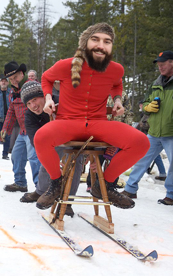 The Race course: The downhill slope should be a minimum of 30' and be of sufficient grade to enable for gravity to propel racers past the finish line. The course should be a minimum of 20' wide and allow enough barricade or berm so that racers do not crash into spectators. The race course should be snow covered. There is a caution that the grade be not too steep or long that a fall or crash results in great bodily injury. The Barstool racer: One bar stool mounted on two skis, any type of stool is OK Minimum height of stool with skis attached -- 27 inches. Maximum outside width of skis at their widest point -- 18 inches. No outriggers or ribs are allowed. Ski's can be of any standard downhill or cross country type no more than 4'” wide or no less than 2” wide. A push bar mounted or detached on the back for a pushing start that can not extend more than 4' beyond the back legs of the stool. All race sleds must be inspected prior to the race. Race Rules: Two judges required, one at the foul/start line and one at the finish line. Helmet for the rider is required. Contestants Should be at least 21 years of age and may be required to sign a liability release. Can be run as either a double or single elimination event. Push off from Start Line at clear starters signal With a single pusher. Must ride the stool sitting down, butt on top of the stool, and feet not touching the ground. Push Zone is 20 feet long minimum and 24' maximum. Pusher crossing the fowl line or false start may be disqualified or require restart. Interference with another racer may result in disqualification. Absolutely no contestants in underwear or or naked. No modifying sleds after inspection and racing begins. Repairs can be made but only to the original state. All judges rulings are final. Everyone is required to have fun!