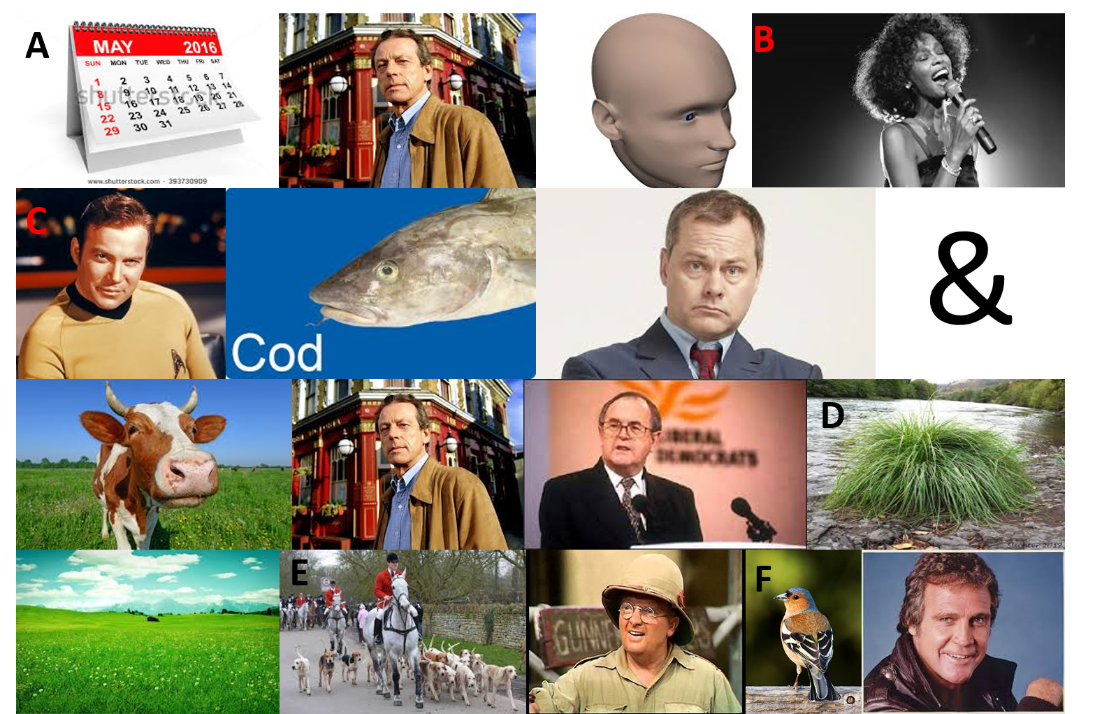 Something a little bit different to the others in the series. Say what you see.......when you have identified A to F and how they are connected, it should be a straightforward task to identify one surname for each one. As a final task, I'd like you to identify what would be the next in the sequence after F (G, it has three words) and its associated surname.