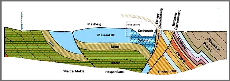 Eine Dolomitisierung von reinem Massenkalk tritt ein, wenn magnesiumhaltiges Wasser - wie hier durch die Ennepe-Überschiebung - zugeführt wird (Dolomitstein besteht hauptsächlich aus dem Mineral Dolomit, chemisch CaMg(CO3)2, Kalzium-Magnesium-Karbonat). Dieser Vorgang vollzog sich vor ca. 310 Mio. Jahren in mehreren aufeinander folgenden Phasen und ist, wie bereits oben erwähnt, gut durch die farbliche Trennung zu erkennen.