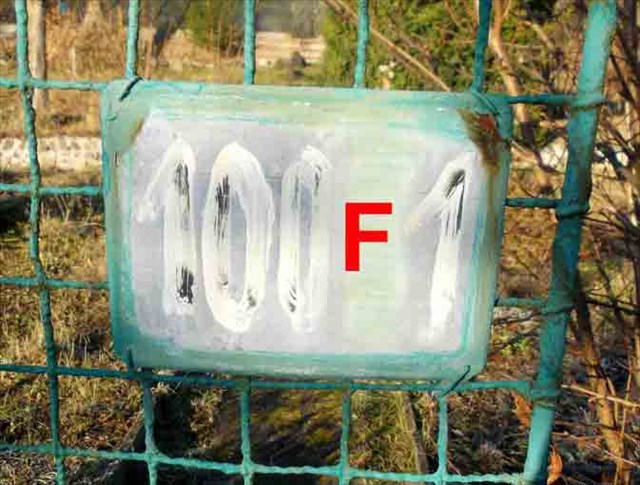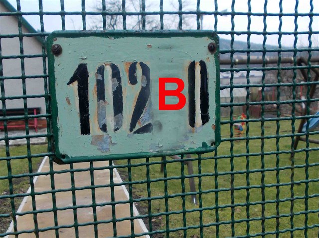Měli byste stát u pěkné zahrádky se zeleným plotem s červenými sloupky. Na červené brance je už méně hezká tabulka s indicií 102B0.