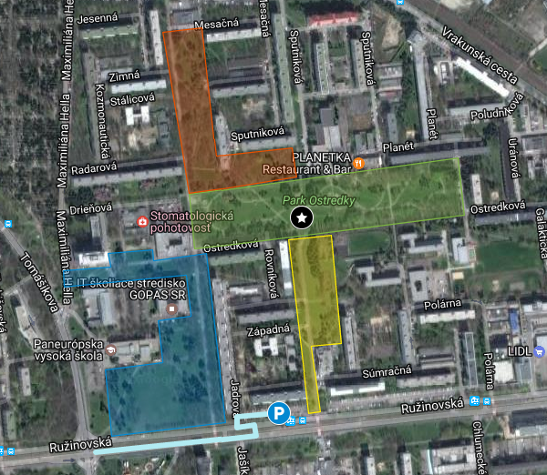 Pokúsime sa vyzbierať odpadky na verejných priestranstvách v parku na Ostredkoch a v jeho okolí - a to v sektoroch, ktoré som vyznačil na tejto mape. Počet, resp. veľkosť sektorov operatívne prispôsobíme účasti na evente.