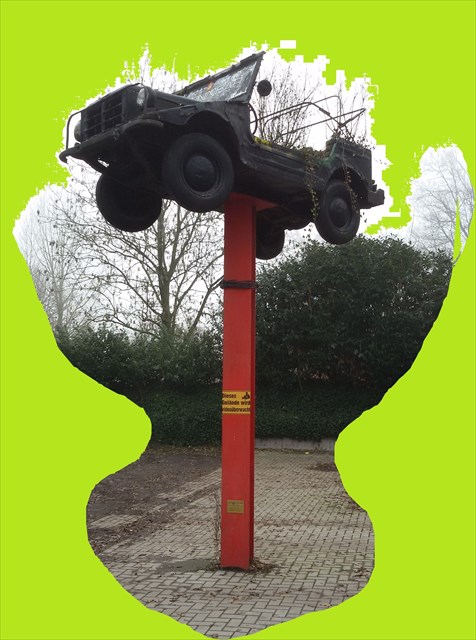 Im Grunde handelt es sich hier nicht um ein Cachemobil und fliegen konnte es auch noch nie. Dieses Gefährt, ein DKW Munga, war viele Jahre im Umzug des Dammer Carneval unterwegs. Jedes Jahr bekam es passend zum Motto der Carnevalsgruppe einen anderen Anstrich. Vor einigen Jahren wurde es auf dieser roten Säule abgestellt. Doch wo ist das?