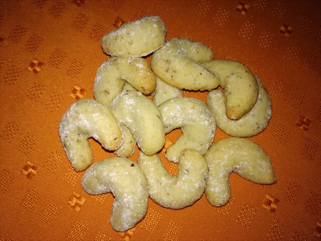 Nejdříve připravíme těsto N49 36,(máslo+mouka+cukr moučka+žloutky+ořechy) dáme péct a na závěr posypeme cukrem E015 33,(cukr ovoněný vanilkovým luskem)