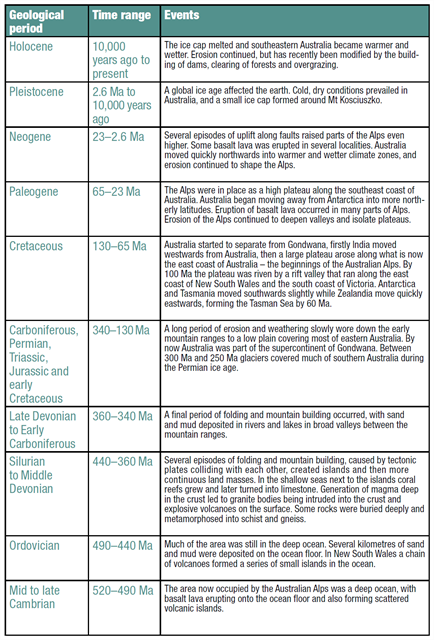 Because the Australian Alps cover a large area, they display a wide range of rock types and a complex geological history spanning 520 million years.