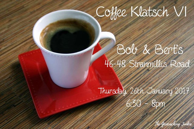The word Kaffeeklatsch allegedly originated in 1900 when German women would gather in one of their homes to drink coffee and chat. Unfortunately, we won't fit many geocachers around my kitchen table so we'll meet at Bob & Bert's on Stranmillis Road instead :)