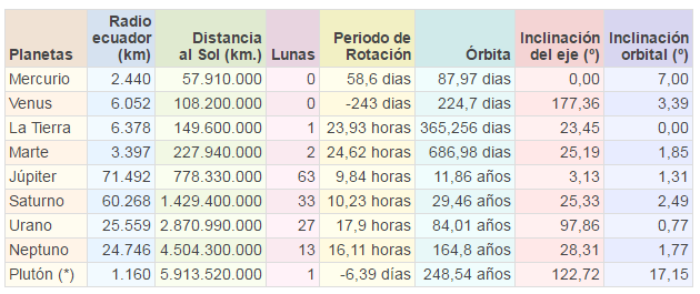 * Pluton dejó de ser considerado un planeta en la Asamblea General de la Unión Astronómica Internacional (UAI) celebrada en Praga el 24 de agosto de 2006. En este sitio, sin embargo, se siguen facilitando sus datos en la lista de planetas.