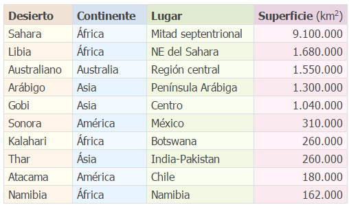 Generalmente se llama desierto a un área cuya precipitación media anual es inferior a 250 mm y donde, en la mayoría de los casos, la evaporación excede a la precipitación como resultado de una temperatura media alta. Debido a la falta de humedad en el suelo y en la atmósfera, los rayos del Sol inciden con fuerza. Las temperaturas durante el día pueden alcanzar los 55 °C a la sombra; durante la noche, el suelo del desierto irradia el calor a la atmósfera y las temperaturas pueden descender hasta el punto de congelación.