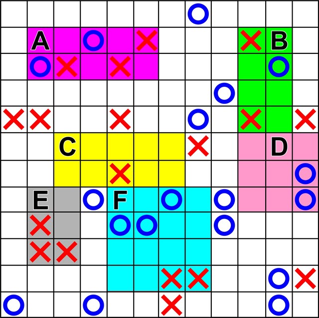 There are six shaded areas, each with a corresponding letter from A to F. Once you've solved the puzzle, count the number of crosses in each area - this is the value of that letter.
