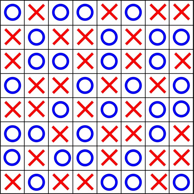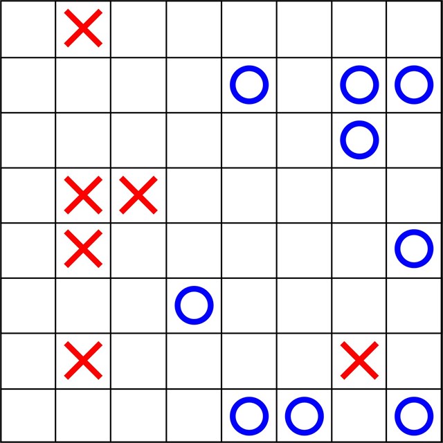 2. You can't have more than two noughts or two crosses together, vertically or horizontally. (Diagonals don't matter).