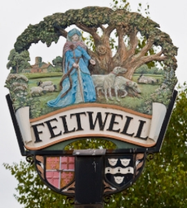 The name of Feltwell is derived from the Saxon meaning "the settlement in the meadow by the stream" and such a meadow forms the backcloth of the village sign upon which everything else is superimposed. Large flocks of sheep used to be kept by the Lords and Ladies of the seven Manors in Feltwell and sheep appear on the meadow to represent the ancient "Sheepwalks". The central portion of the village takes the approximate shape of a figure 8 and this fact is perpetuated in the octagonal base which is also meant as a permanent reminder that the turret of the formerly round-towered church of St. Nicholas was octagonal.