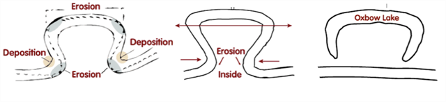 On the inside of the loop, the river travels more slowly leading to deposition of silt. Meanwhile water on the outside edges tends to flow faster, which erodes the banks making the meander even wider. Over time the loop of the meander widens until the neck vanishes altogether. Then the meander is removed from the river's current and the horseshoe shaped oxbow lake is formed. Without a current to move the water along, sediment builds up along the banks and fills in the lake.