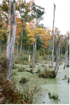 A swamp is a wetland type associated with streams, rivers or lakes which has water flowing through it. They are often confused with marshes but are distinguished by the presence of trees and shrubs. Swamps occur on saturated soils and are flooded for most or all of the growing season. The main swamp region in Ontario occurs in the Great Lakes region.