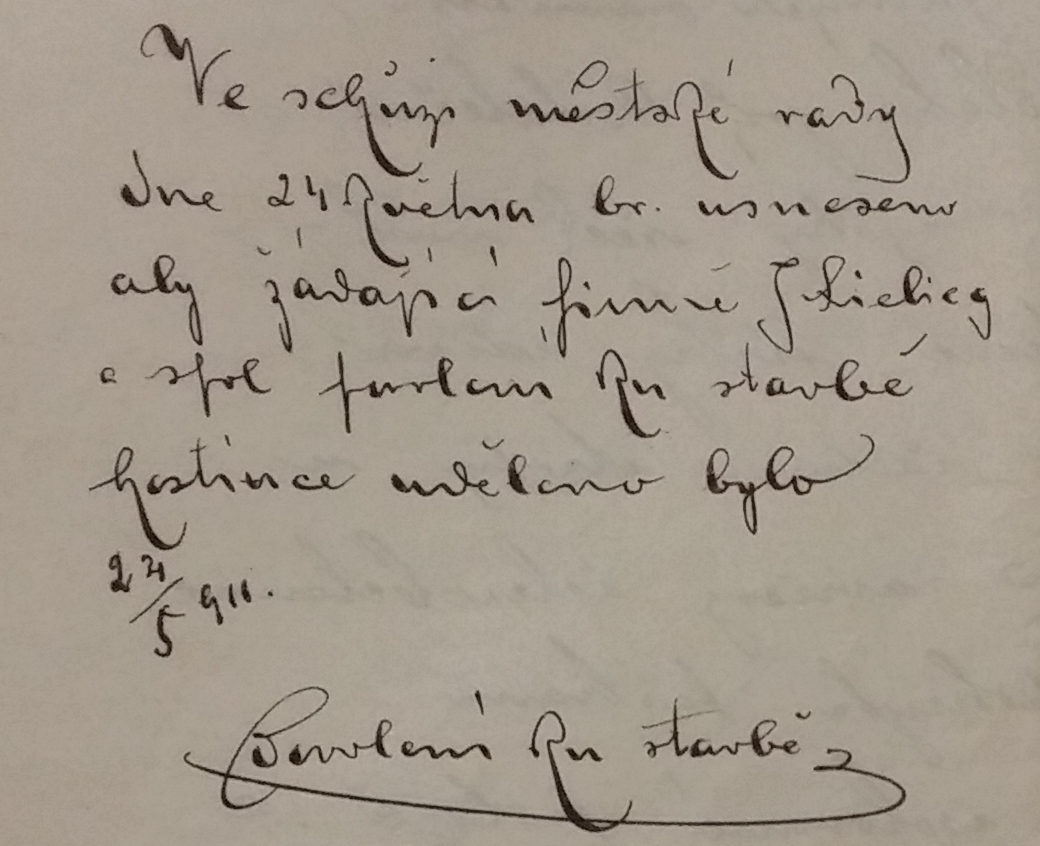 “Z ohledů veřejných nevstává proti novostavbě této žádných námitek. Jelikož ani z ohledů technických znalcem stavby žádné námitky činěny nejsou a dle prohlášení téhož stavba tak podle předložených plánů jest proveditelná , činí stavební sbor návrh, aby Fi. Jan Liebig & spol bylo dáno povolení ku postavení hostincem čparc. 793 dle předloženého plánu.