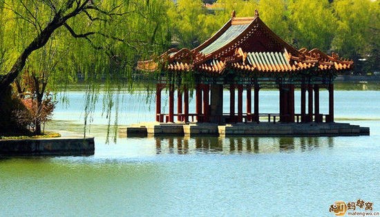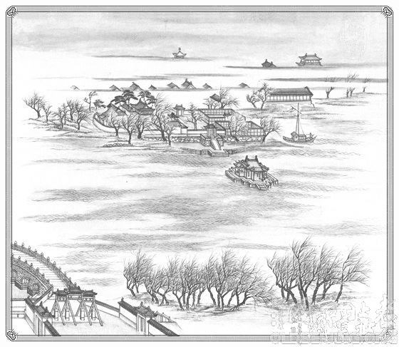 太液秋风在太液池,即今中南海的中海之中。在水东岸万善殿西侧水面上,有一敞轩凉亭称“水云榭”,榭中立有景名牌。《燕京八景图》中记述说:“天气晴明,日月晃漾而波澜涟漪清澈可爱,故曰太液晴波。”因乾隆帝诗中有“秋到宸居爽籁生,玉湖澄碧画桥横”之句,故被钦定为太液秋风。